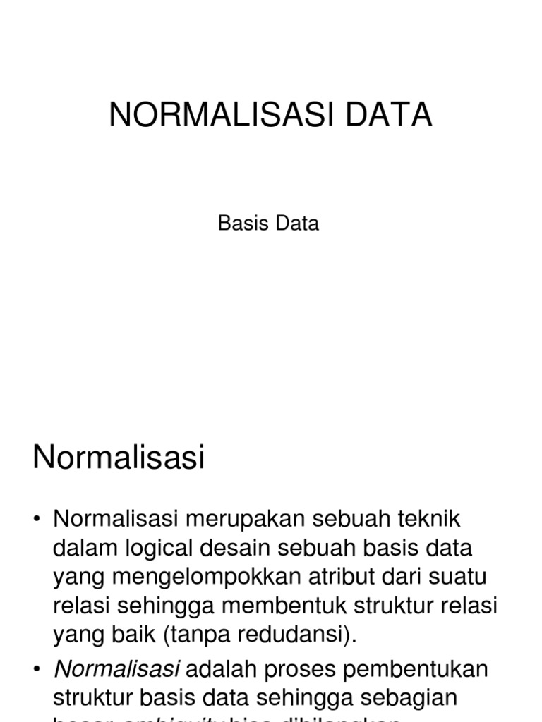 Di buat oleh dwi budiati Hal yang dapat dilakukan dalam normalisasi data adalah insert,update,delete, dan modifikasi pada satu atau. Definisi normalisasi normalisasi adalah suatu teknik untuk memperbaiki struktur tabel dengan ketergantungan fungsional(kf) dan primary key. Apa yang dimaksud dengan dml? Pengolahan data adalah data yang belum berupa informasi karena datanya masih di kelolah atau di buat.