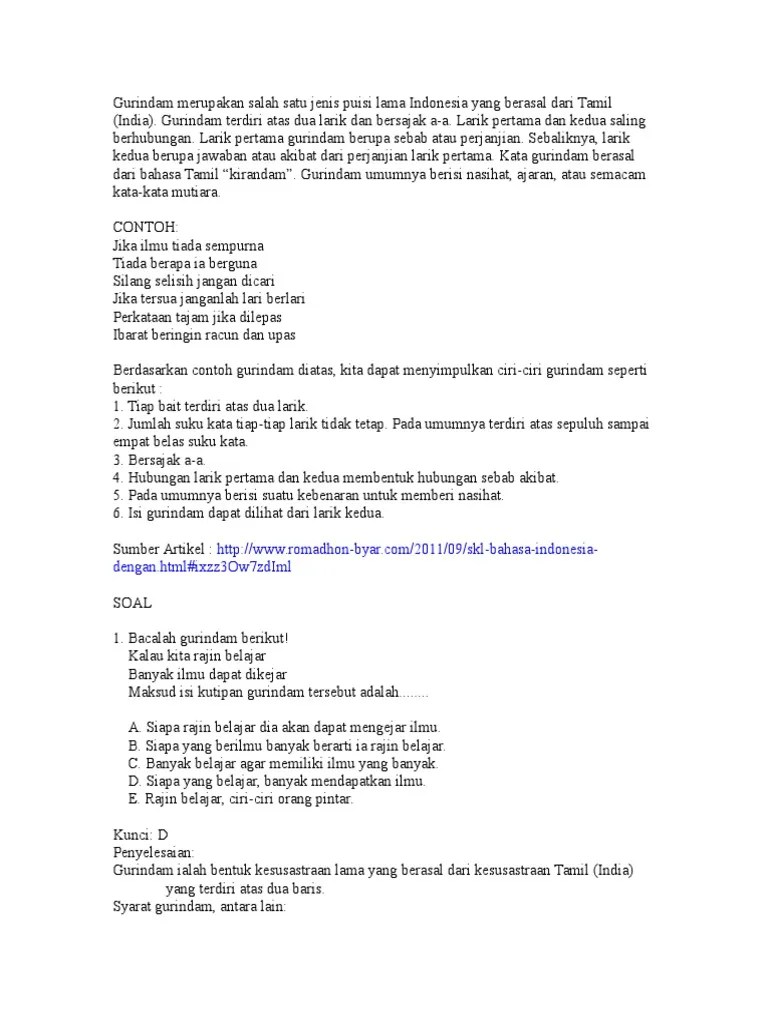 Sastra melayu yang bersajak sebelum kedatangan islam terdiri dari berbagai bentuk. Sama halnya pantun, gurindam juga mempunyai ciri khas tersendiri, sehingga sangat. Gurindam adalah puisi lama yang terdiri dari dua bait, tiap bait terdiri dari dua baris kalimat dengan rima yang sama dan merupakan satu . Yang terkenal adalah pantun, seloka dan gurindam (ismail hamid, . Empat baris yg sama bunyi hujungnya);